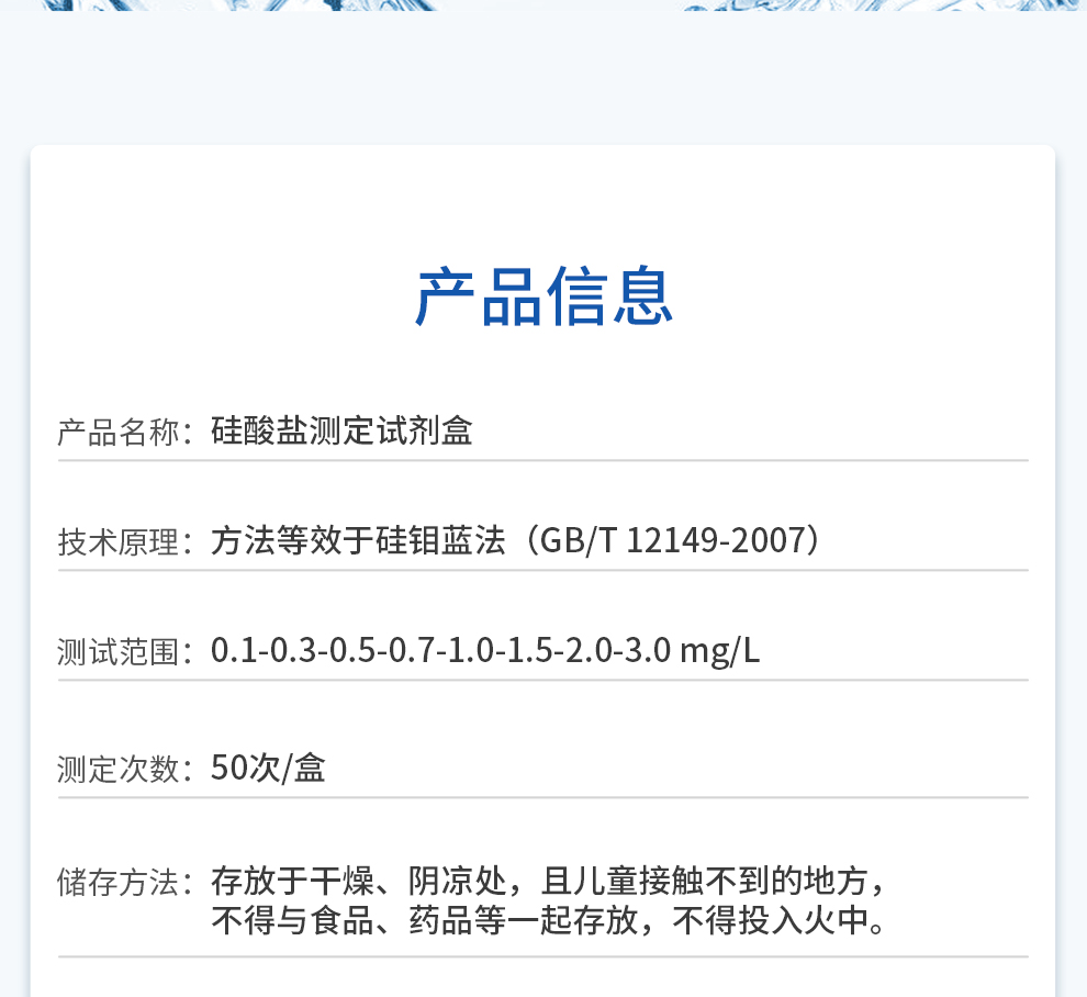 【產(chǎn)品名稱】 硅酸鹽測定試劑盒 0.1-3.0mg/L