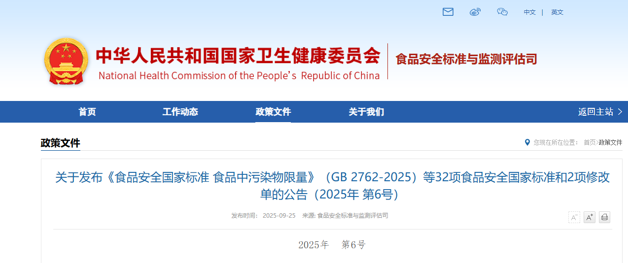 關于發(fā)布《食品安全國家標準 食品中污染物限量》(GB 2762-2025)等32項食品安全國家標準和2項修改單的公告(2025年 第6號)