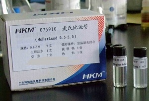 麥?zhǔn)媳葷峁苁荕cFarland發(fā)明的一種用于微生物比濁的不同濁度的標(biāo)準(zhǔn)濁度管。具體的配制方法是根據(jù)硫酸和氯化鋇的比例來定的,不同比例生成的硫酸鋇沉淀的濃度不同,且都有定值。