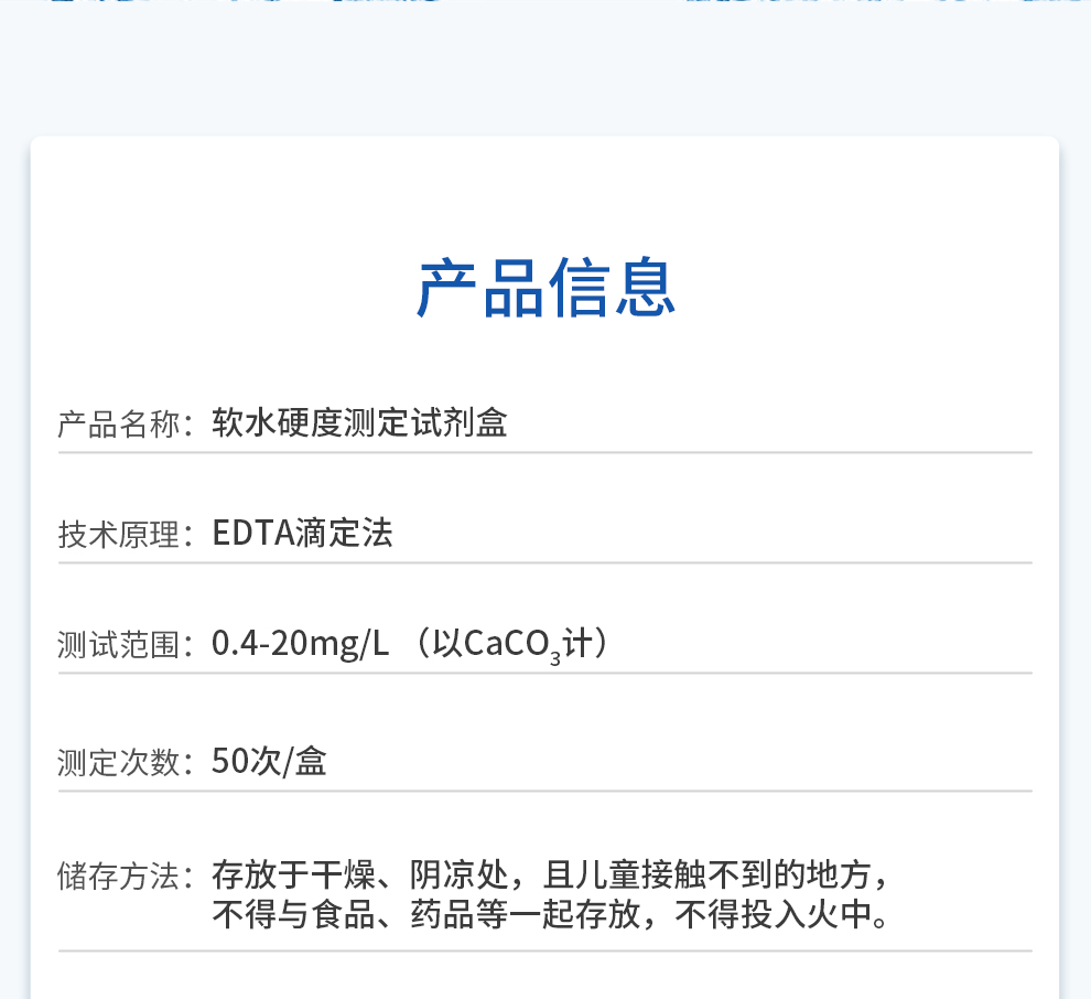 【產(chǎn)品名稱】軟水硬度測(cè)定試劑盒(0.4-20mg/L)