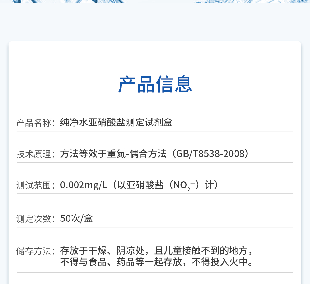 【產(chǎn)品名稱】純凈水亞硝酸鹽測定試劑盒 0.002mg/L