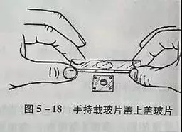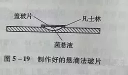 (2)用接種環(huán)挑取一小環(huán)菌株置于操作好的干凈蓋玻片上,不要讓液滴散開(見圖5-17)。