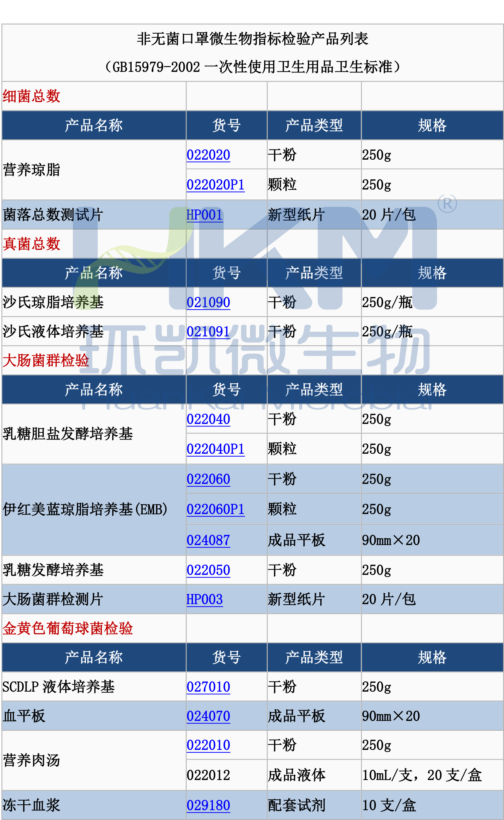 環(huán)凱提供口罩微生物檢測系列產(chǎn)品,包括非無菌口罩的細菌菌落總數(shù)檢測、大腸菌群檢測、綠膿桿菌檢測、黃金色葡萄球菌檢測、溶血性鏈球菌檢測、真菌菌落總數(shù)檢測等指標,以及無菌口罩無菌檢查所需的檢測產(chǎn)品,依據(jù)標準分別是GB15979-2002一次性使用衛(wèi)生用品衛(wèi)生標準及2015版中國藥典無菌檢查法。