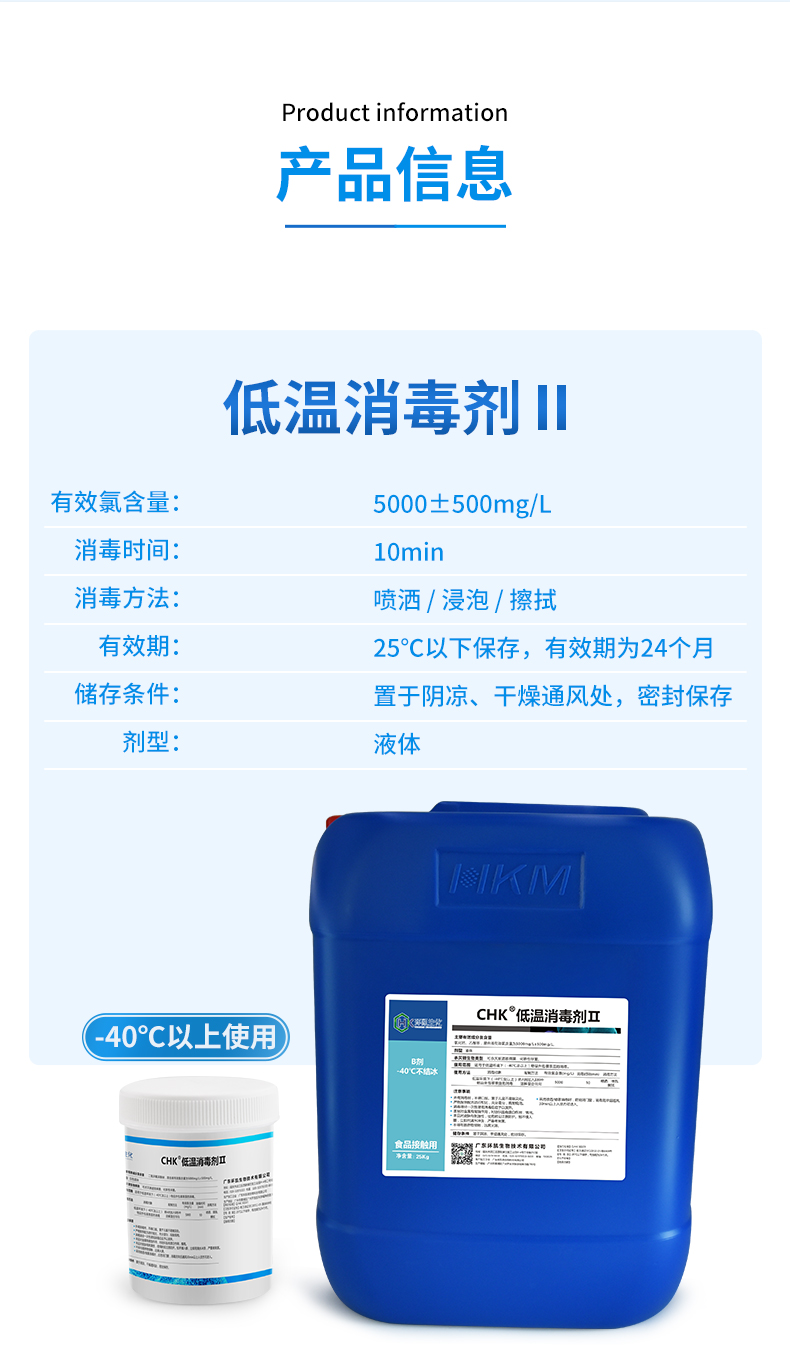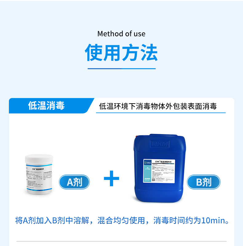 【產品介紹】本品是以二氯異氰尿酸鈉為主要有效成分的消毒劑,混合液有效氯含量為5000mg/L士500mg/L,適用于低溫環(huán)境下(-40C及以上)物品外包裝表面的消毒。