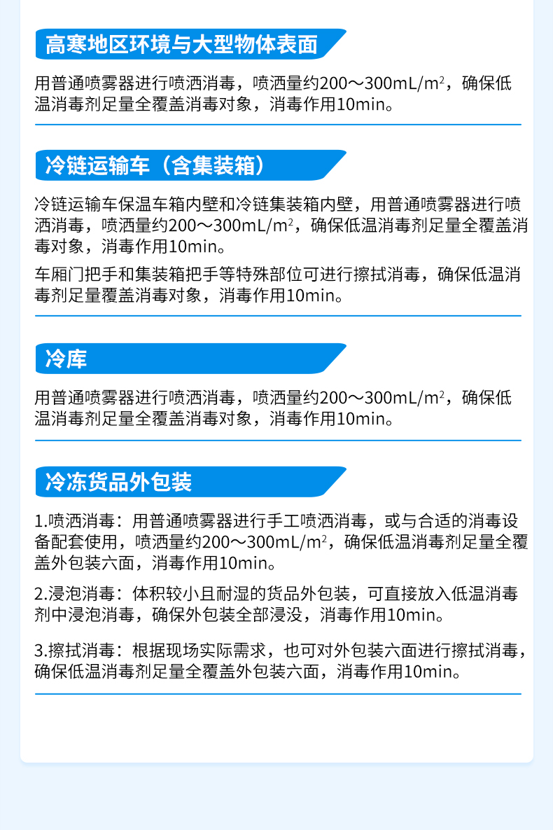 1、低溫環(huán)境不結冰:適用于-40°C及以上低溫環(huán)境下硬質物體表面及物品外包裝表面的消毒。