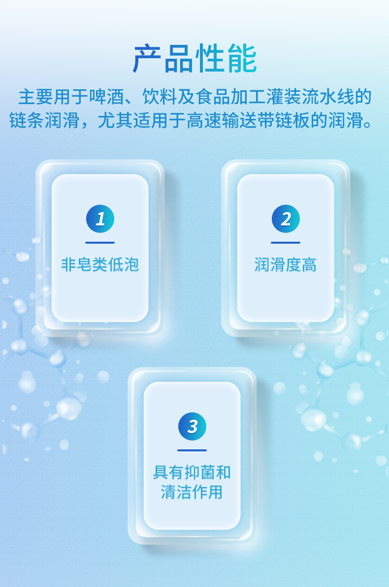 【產(chǎn)品性能】本品是一種非皂類低泡潤滑劑,主要用于啤酒、飲料及食品加工灌裝流水線的鏈條潤滑尤其適用于高速輸送帶鏈板的潤滑。本產(chǎn)品潤滑度高,同時具有抑菌和清潔作用。