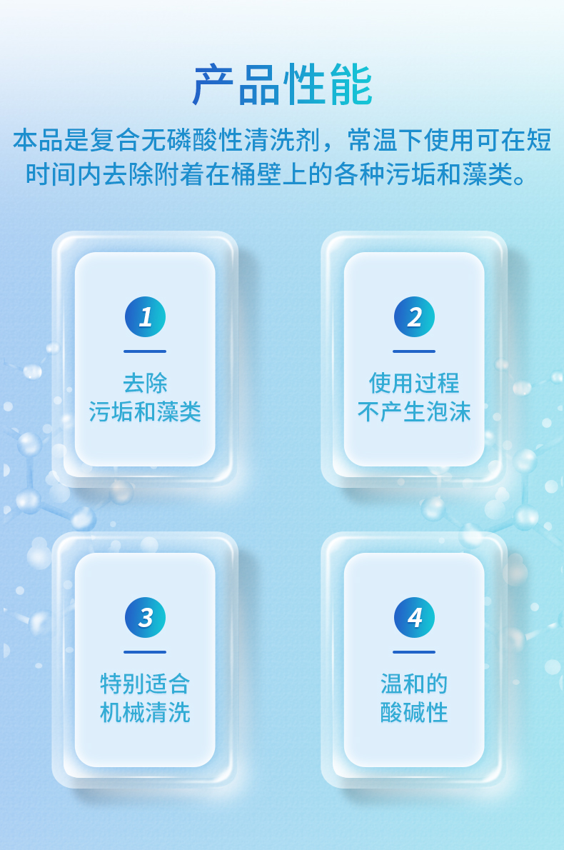 2、無毒 設(shè)備友好:采用食品級原材料,使用過程不產(chǎn)生泡沫,特別適合機械清洗。強的緩蝕性能,對加熱管和洗滌槽無腐蝕。
