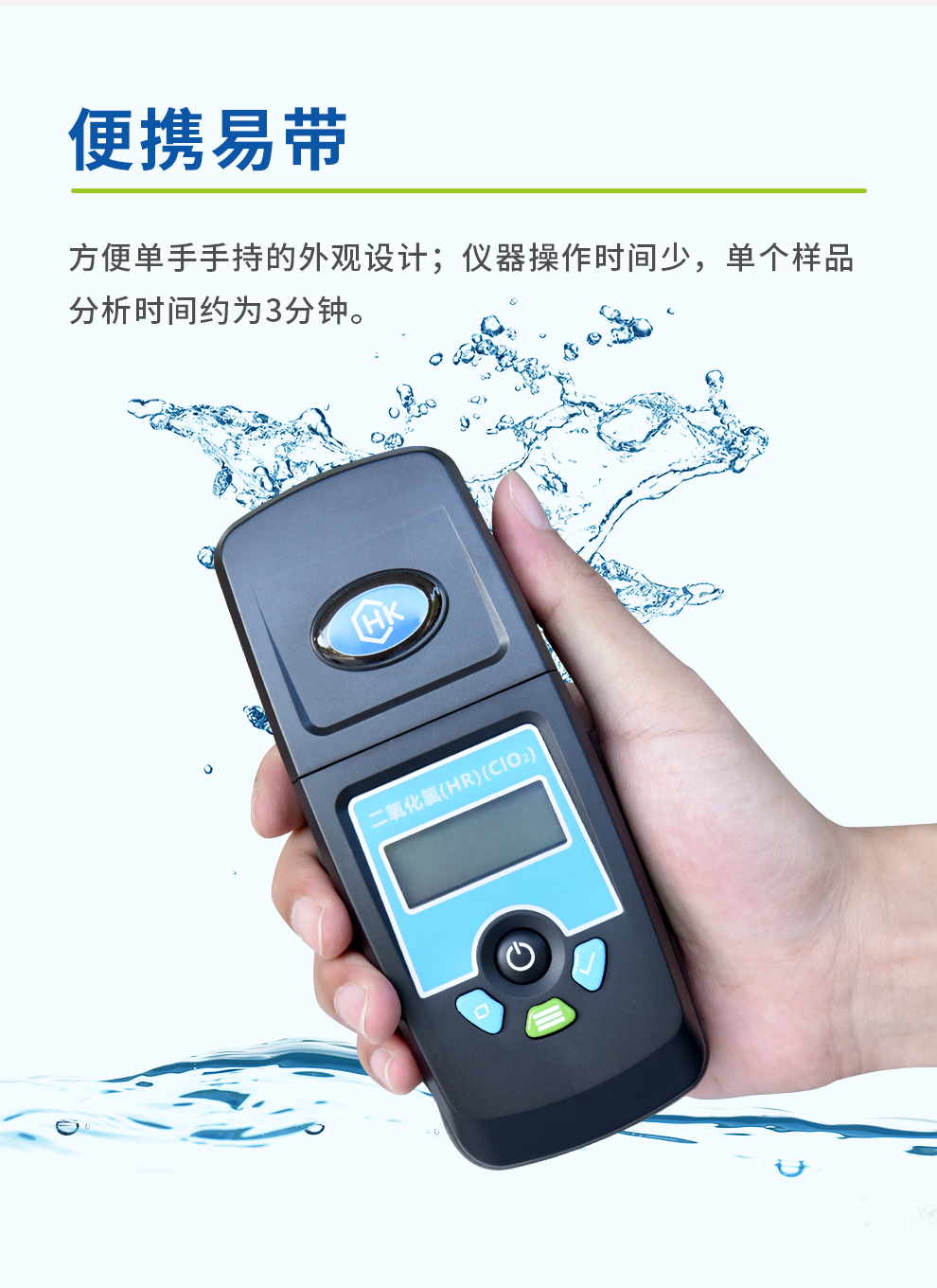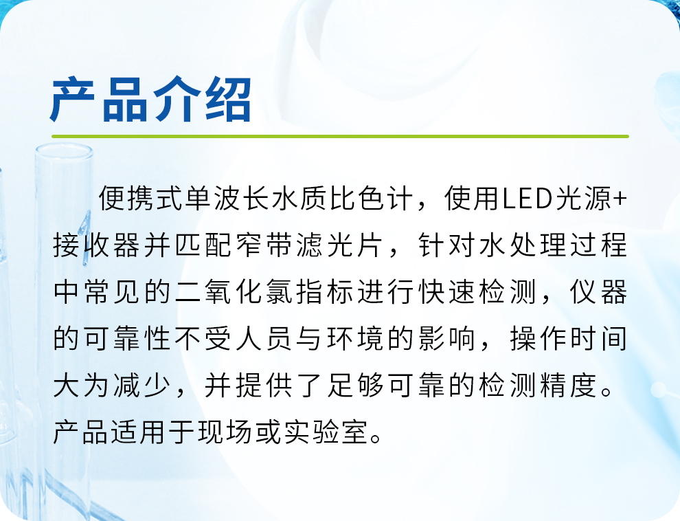 【應(yīng)用范圍】適用于經(jīng)二氧化氯消毒的水中殘留二氧化氯濃度的測定。顯示屏以mg/L來直接顯示樣品中二氧化氯的濃度。