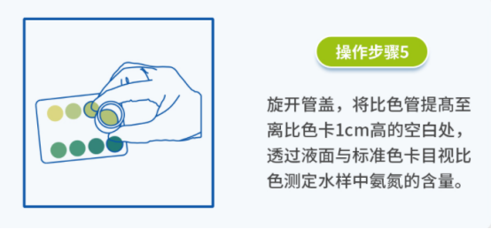 6、旋開管蓋,將比色管提高至離比色卡1cm高的空白處透過液面與標(biāo)準(zhǔn)色卡目視比色測定水樣中氨氮的含量。(mg/L,以N計)