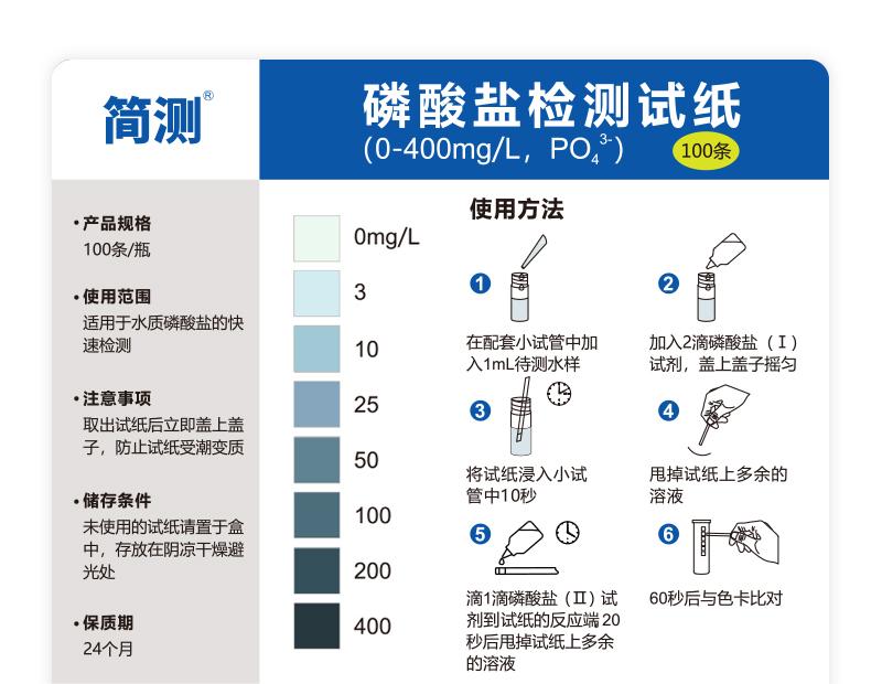 在配套小試管中加如1mL待測水樣,加入2滴磷酸鹽(Ⅰ)試劑,蓋上蓋子搖勻,將試紙浸入小試管中10秒,甩掉試紙上多余的溶液,滴1滴磷酸鹽(Ⅱ)試劑到試紙反應(yīng)端20秒后甩掉試紙上多余溶液,60秒后與色卡對比。觀察試紙的顯色效果,與標(biāo)準(zhǔn)色卡進(jìn)行對比,與試紙上色調(diào)相同的色階指示濃度即為樣品中磷酸鹽的含量(mg/L)。
