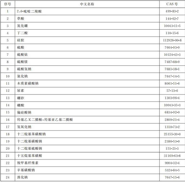 B.2 表 B.2規(guī)定了允許使用的食品用消毒劑輔助成分名單。表 B.2中物質(zhì)的含結(jié)晶水物質(zhì),酸類、醇類或酚類物質(zhì)的鈉鹽、鉀鹽、鈣鹽和銨鹽(包括酸式鹽和復(fù)鹽)允許用作食品用消毒劑的輔助成分。