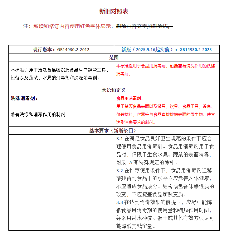 近日,國(guó)家衛(wèi)生健康委食品安全標(biāo)準(zhǔn)與監(jiān)測(cè)評(píng)估司發(fā)布50項(xiàng)食品安全國(guó)家標(biāo)準(zhǔn)和9項(xiàng)修改單,其中包括了GB?14930.2-2025《消毒劑》,該標(biāo)準(zhǔn)將于2025年9月16日起正式實(shí)施,與上一版(GB?14930.2-2012)相比,新版標(biāo)準(zhǔn)在標(biāo)準(zhǔn)范圍、術(shù)語(yǔ)、基本要求、原料要求、理化指標(biāo)等多個(gè)方面均進(jìn)行了重大修訂,并且新增了兩個(gè)附錄,為了便于對(duì)比,我們制作了兩個(gè)版本的新舊對(duì)照表并轉(zhuǎn)載了由國(guó)家食品安全評(píng)估中心制作的一圖讀懂,同時(shí)將新增的附錄A和附錄B完整摘錄,供大家學(xué)習(xí)↓↓↓